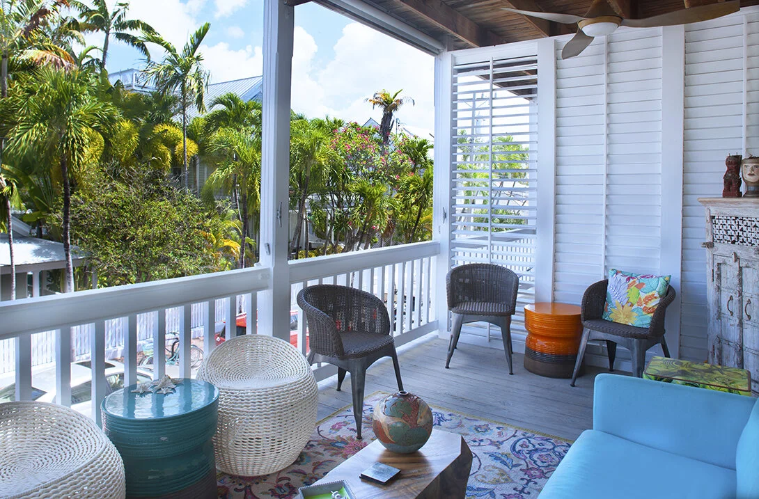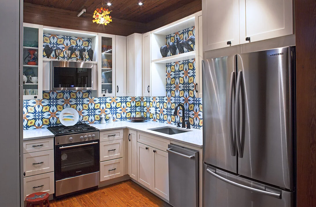 Pops of blues echo the sea, causing an uninterrupted focal point.